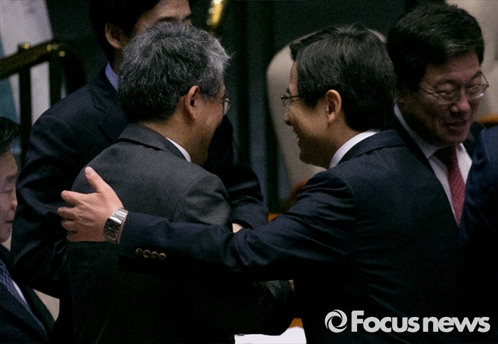 (서울=포커스뉴스) 5일 오후 서울 여의도 국회에서 열린 343회 국회(임시회) 7차 본회의, 정치·외교·통일·안보·교육·사회·문화에 관한 질문에 참석한 황교안 국무총리가 회의 속개를 기다리며 김동철 국민의당 의원과 악수하고 있다. 이날 대정부 질문은 이장우 새누리당 의원 등과 김동철 국민의당 의원의 언쟁으로 오전 회의가 정회됐었다.