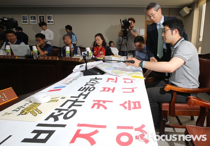 (세종=포커스뉴스) 5일 오후 세종시 정부세종청사 고용노동부 최저임금위원회에서 열린 제9차 전원회에서 박준성 위원장이 근로자위원들과 인사를 하던 중, 근로자위원 자리에 올려진 '비정규노동자가 지켜보고 있다'라는 문구와 청년들이 남긴 메모를 살피고 있다.