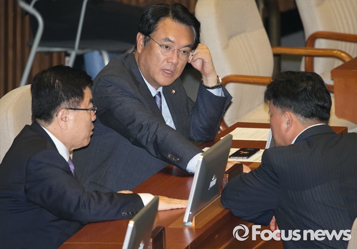 정진석 원내대표는 사드(THAAD·고고도미사일방어) 배치 최적지로 경북 칠곡이 거론되는 것을 두고는 "사드 배치 문제는 국익을 최우선으로 생각하고 접근해야 한다"며 "결정되지 않은 사안에서 확실하지 않은 부분이 알려지면 불필요한 갈등이 증폭되는 만큼 신중한 보도를 바란다"고 말했다.5일 오후 서울 여의도 국회에서 열린 343회 국회(임시회) 7차 본회의, 정치·외교·통일·안보·교육·사회·문화에 관한 질문에 참석한 정진석(가운데) 새누리당 원내대표, 김광림(왼쪽) 정책위의장, 김명연 의원이 대화하고 있다. 2016.07.05 박동욱 기자