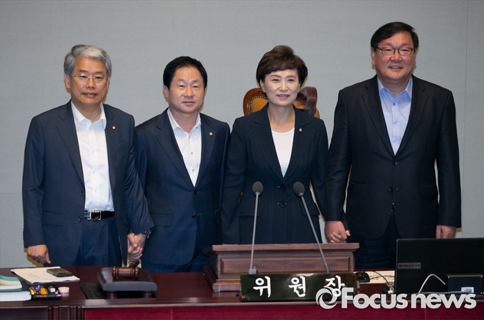 (서울=포커스뉴스) 6일 오전 서울 여의도 국회에서 열린 예산결산특별위원회 전체회의에 참석한 김현미 위원장과 3당 간사가 취재진을 향해 포즈를 취하고 있다. 왼쪽부터 김동철 국민의당 간사, 주광덕 새누리당 간사, 김 위원장, 김태년 더불어민주당 간사.