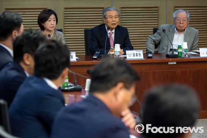 (서울=포커스뉴스) 김종인(오른쪽 두 번째) 더불어민주당 비상대책위 대표가 6일 오전 서울 여의도 국회의원회관에서 열린 '따뜻한 미래를 위한 정치기획 창립기념 특강'에 참석해 축사 하고 있다.