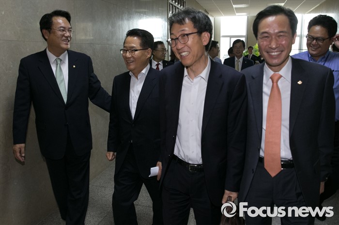 (서울=포커스뉴스) 6일 오후 서울 여의도 국회에서 운영위원회 전체회의를 마친 정진석(왼쪽부터) 새누리당 원내대표, 박지원 국민의당 원내대표, 이훈 더불어민주당 의원, 우상호 원내대표가 이동하고 있다.