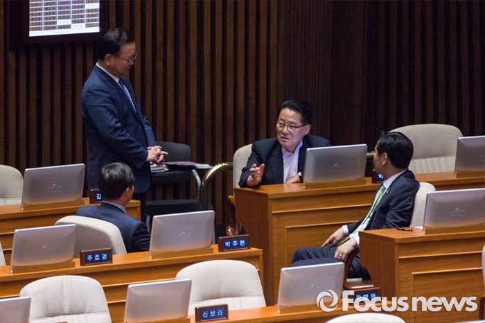 (서울=포커스뉴스) 박지원(오른쪽 두 번째) 국민의당 비상대책위원장이 6일 오후 서울 여의도 국회에서 열린 '제343회 국회(임시회) 제8차 본회의'에 참석해 김부겸(왼쪽 두 번째) 더불어민주당 의원 및 동료 의원들과 대화 하고 있다.