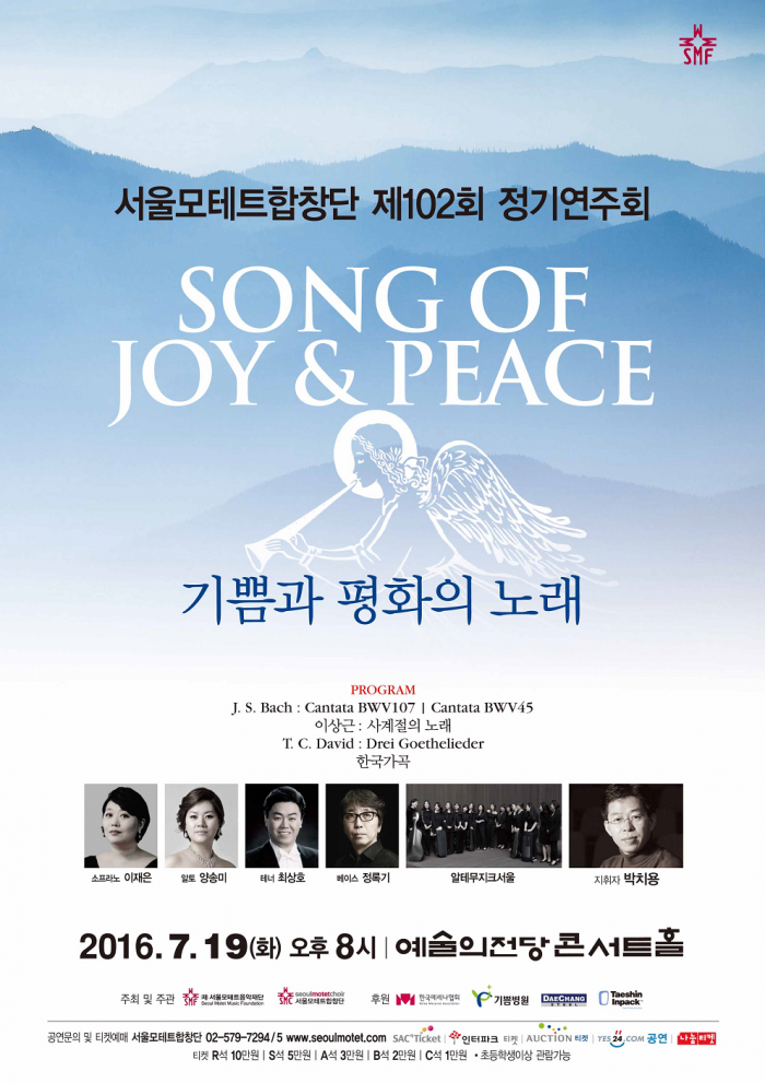 서울모테트합창단의 102회 정기연주회 '기쁨과 평화의 노래'는 지휘 박치용, 소프라노 이재은, 알토 양송미, 테너 최상호, 바리톤 정록기와 오케스트라에 알테무지크서울(Alte Musik Seoul)이 협연한다.서울모테트합창단 제102회 정기연주회 포스터.<사진제공=서울모테트합창단>