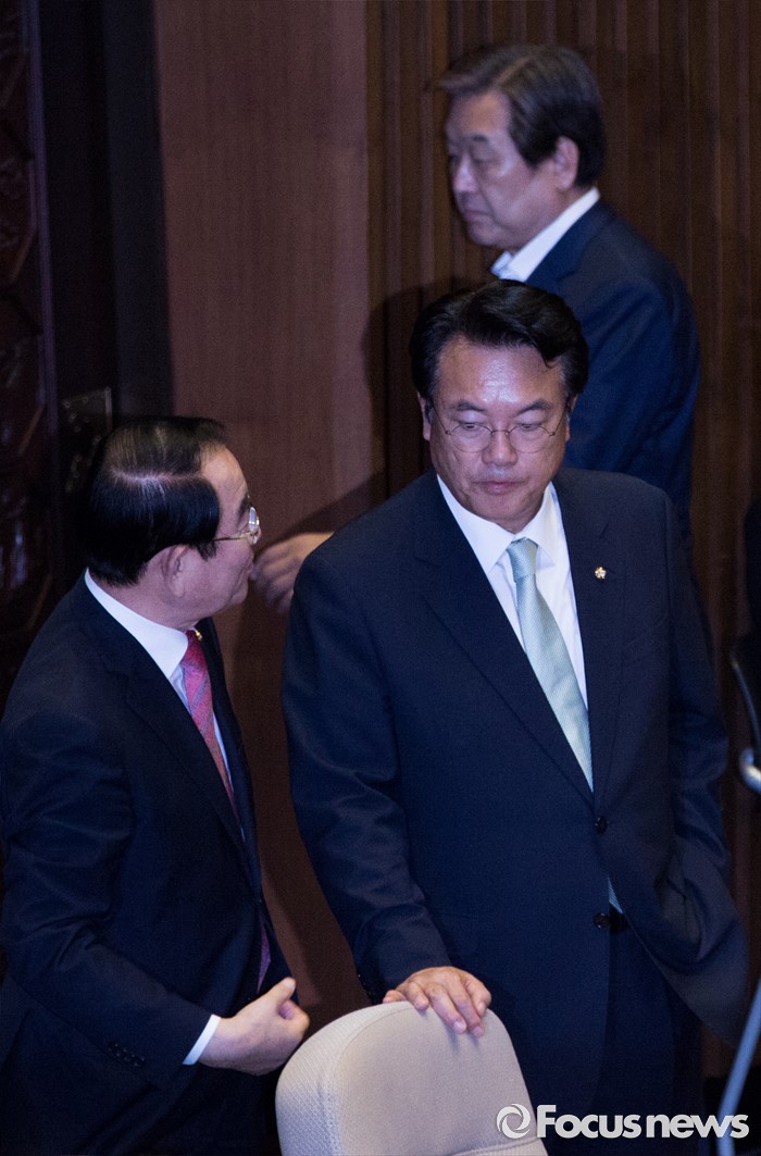 (서울=포커스뉴스) 정진석(왼쪽 두 번째) 새누리당 원내대표와 박명재(왼쪽) 새누리당 사무총장이 6일 오후 서울 여의도 국회에서 열린 '제343회 국회(임시회) 제8차 본회의'에 참석해 대화 하고 있다.