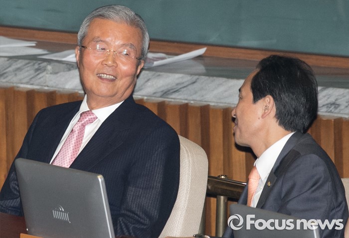 (서울=포커스뉴스) 6일 오후 서울 여의도 국회에서 열린 343회 국회(임시회) 8차 본회의에 참석한 김종인(왼쪽) 더불어민주당 비대위 대표와 우상호 원내대표가 대화하고 있다.