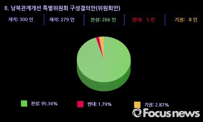 (서울=포커스뉴스) 6일 오후 서울 여의도 국회에서 열린 343회 국회(임시회) 8차 본회의에서 남북관계개선 특별위원회 구성결의안이 재석 279인 중 찬성 266인, 반대 5인, 기권 8인으로 통과되고 있다.