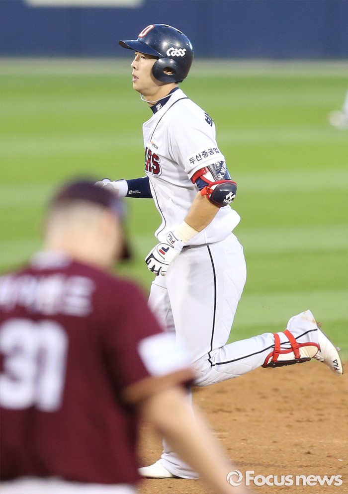 (서울=포커스뉴스) 6일 서울 잠실구장에서 열린 2016 프로야구 넥센-두산 경기 4회말 1사 1루에서 두산 박건우가 우월 2점 홈런을 치고 그라운드를 돌고 있다.