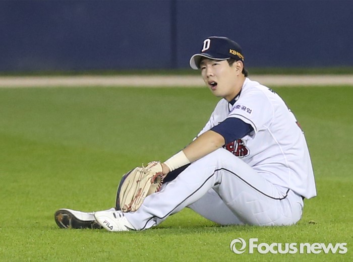 (서울=포커스뉴스) 6일 서울 잠실구장에서 열린 2016 프로야구 넥센-두산 경기 6회초 무사 1,2루에서 두산 우익수 박건우가 넥센 김하성의 타구를 빠트리고 그라운드에 주저앉아 아쉬워하고 있다.