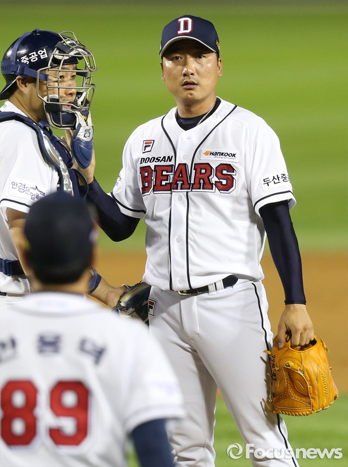 (서울=포커스뉴스) 6일 서울 잠실구장에서 열린 2016 프로야구 넥센-두산 경기 9회초 두산 투수 정재훈이 실점하자 한용덕 코치가 마운드로 올라가고 있다.