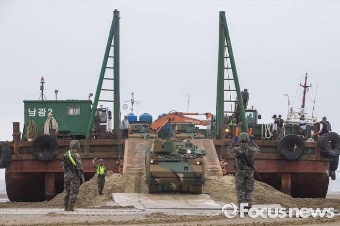 (태안=포커스뉴스) 7일 오전 충청남도 태안군 안면읍 인근 해안에서 2016 합동 해안양륙군수지원(J LOTS) 훈련이 열리고 있다. 합동참모본부 주관으로 해군과 해병대, 육군, 해경이 참가하는 합동 해안양륙군수지원 훈련은 항만 사용이 불가한 지역에서 작전을 수행중인 전투부대에 군수지운을 하기 위한 작전이다.