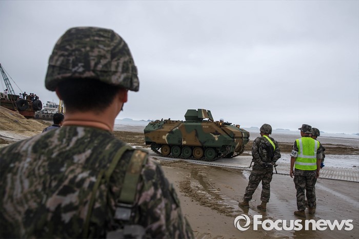 (태안=포커스뉴스) 7일 오전 충청남도 태안군 안면읍 인근 해안에서 2016 합동 해안양륙군수지원(J LOTS) 훈련이 열리고 있다. 합동참모본부 주관으로 해군과 해병대, 육군, 해경이 참가하는 합동 해안양륙군수지원 훈련은 항만 사용이 불가한 지역에서 작전을 수행중인 전투부대에 군수지운을 하기 위한 작전이다.