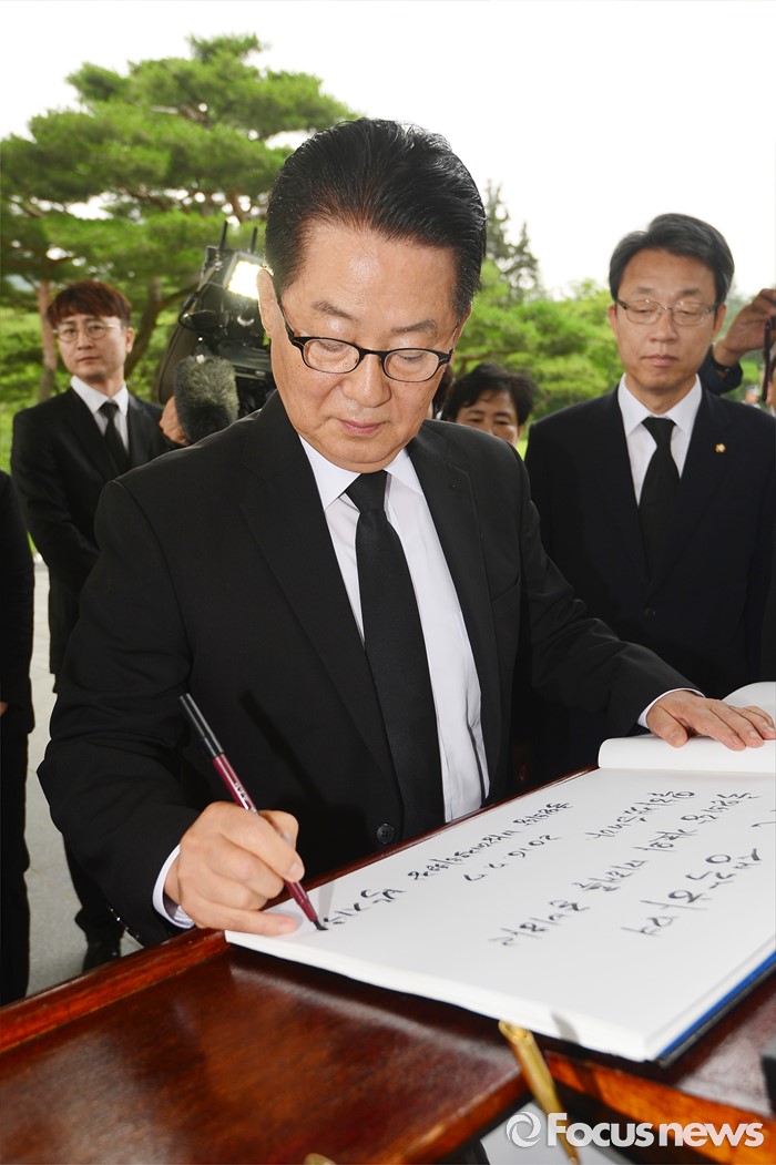 (서울=포커스뉴스) 박지원 국민의당 비상대책위원장이 7일 오전 동작구 국립서울현충원을 방문해 현충탑을 참배한 뒤 방명록을 작성하고 있다.