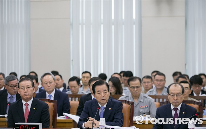 (서울=포커스뉴스) 7일 오전 서울 여의도 국회에서 열린 국방위원회 전체회의에 참석한 한민구 국방부 장관이 의원들의 질의에 답하고 있다. 왼쪽부터 박창명 병무청장, 한 장관, 장명진 방위사업청장.