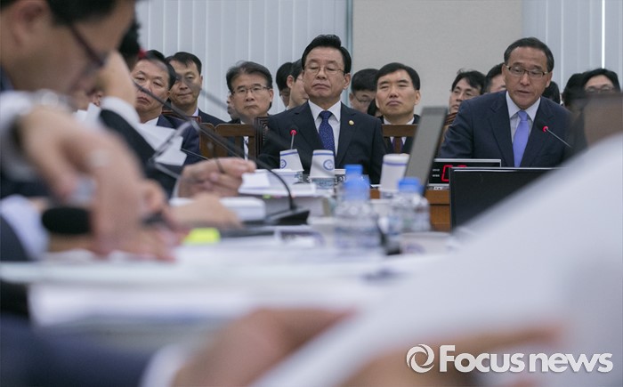 (서울=포커스뉴스) 7일 오전 서울 여의도 국회에서 열린 안전행정위원회 전체회의에 참석한 홍윤식(오른쪽) 행정자치부 장관이 의원들의 질의에 답하고 있다. 가운데는 박인용 국민안전처 장관.
