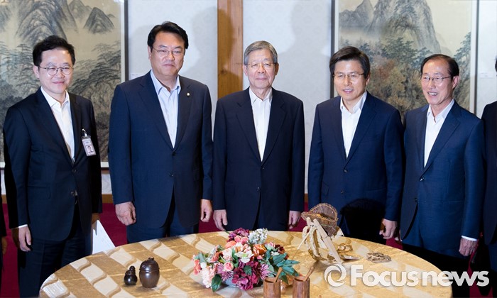 (서울=포커스뉴스) 7일 오후 서울 종로구 삼청동 국무총리공관에서 열린 당·정·청 정책조정협의회에서 참석자들이 기념촬영을 하고 있다. 왼쪽부터 강석훈 청와대 경제수석, 정진석 새누리당 원내대표, 김희옥 혁신비상대책위원장, 황교안 국무총리, 이원종 대통령 비서실장.