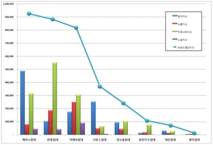 1위인 에이스침대는 △참여지수 48만8000 △소통지수 7만8903 △커뮤니티지수 31만4991 △소셜지수 4만4267로 총 브랜드평판지수는 92만6161로 집계됐다. 이는 지난 6월 브랜드평판지수 75만8501에서 22.10% 상승한 수치다.