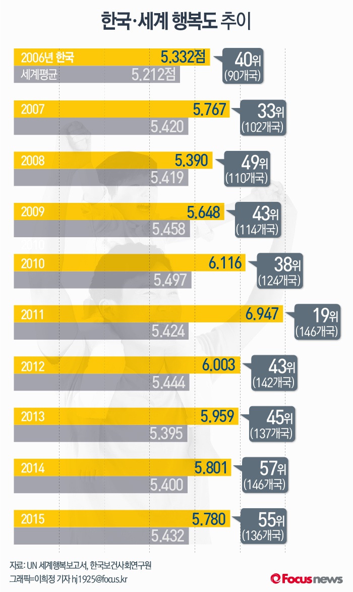 (서울=포커스뉴스) 3월 UN이 발표한 '세계행복보고서 2016'에 따르면 2015년 한국의 행복도는 세계 평균치와 비슷한 보통 정도로 나타났다.