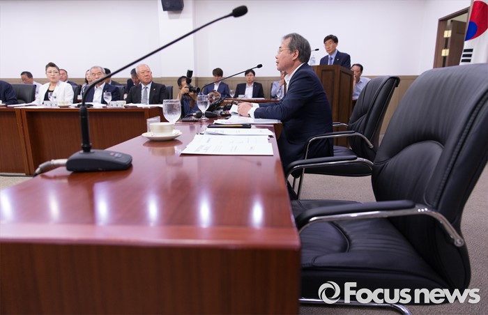 | △ 모두발언하는 강영중 회장, 비어있는 김정행 회장 자리 |
