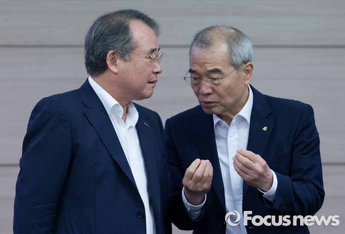 (서울=포커스뉴스) 8일 오전 서울 송파구 올림픽파크텔에서 열린 대한체육회 제4차 긴급 임시 이사회에서 강영중(왼쪽) 대한체육회 회장과 조영호 사무총장이 이야기를 나누고 있다. 이번 임시 이사회에서는 박태환의 리우 올림픽 출전 여부가 긴급 안건으로 상정됐다.