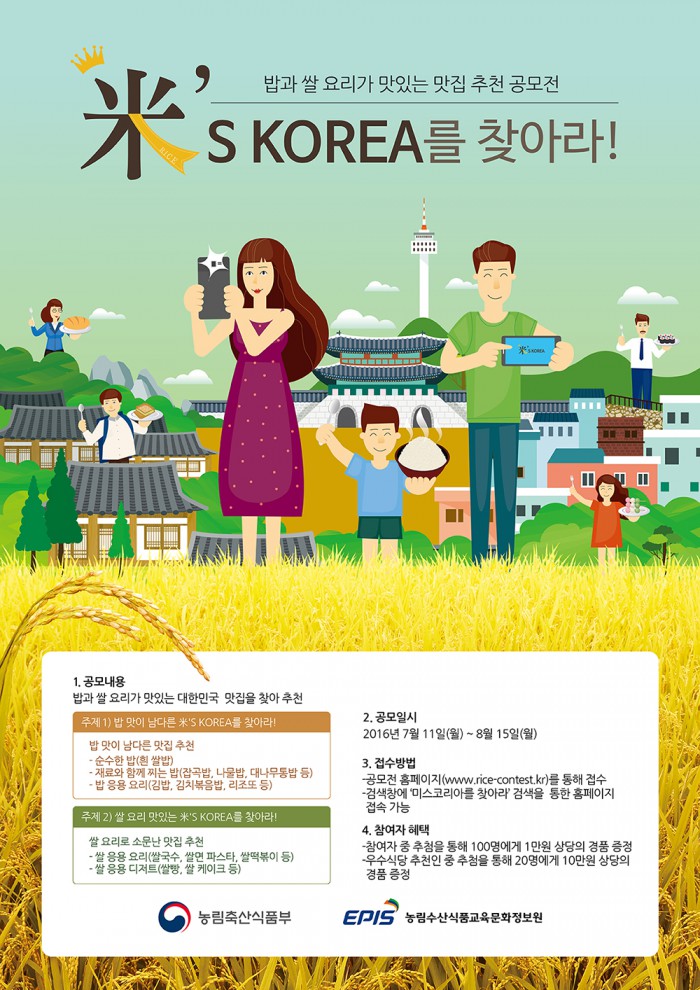 이번 공모전은 ‘밥 맛이 남다른 米’s KOREA'와 ‘쌀 요리로 소문난 米’s KOREA’ 2개 부문으로 운영되며, 국민들이 전국 곳곳에 숨겨진 쌀 요리 맛을 해당 사이트에서 직접 추천하는 방식으로 진행된다.