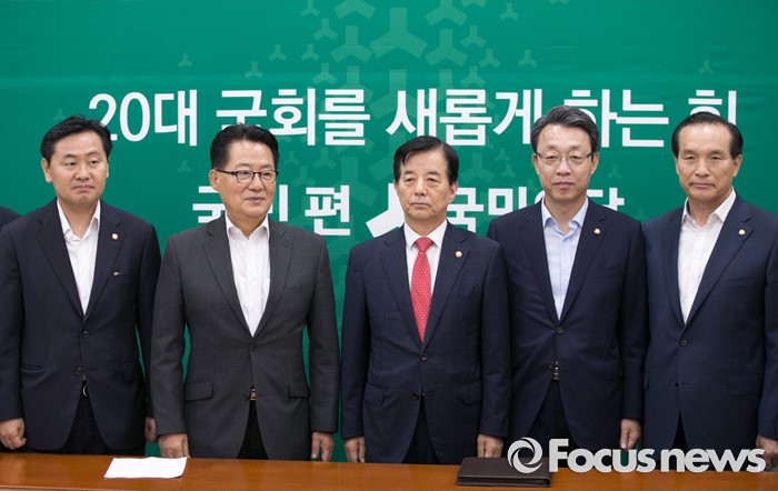 (서울=포커스뉴스) 한민구 국방부 장관이 8일 오전 서울 여의도 국회를 방문해 사드배치 등과 관련 국민의당 지도부와 면담에 앞서 취재진을 향해 포즈를 취하고 있다. 왼쪽부터 김관영 원내수석부대표, 박지원 비대위원장, 한 장관, 김성식 정책위의장, 김중로 국방위 간사.