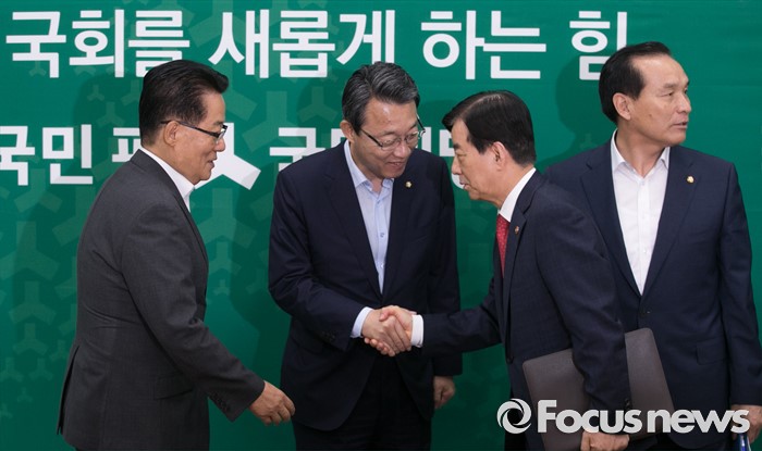 (서울=포커스뉴스) 한민구 국방부 장관이 8일 오전 서울 여의도 국회를 방문해 사드배치 등과 관련 국민의당 지도부와 면담에 앞서 인사하고 있다. 왼쪽부터 박지원 비대위원장, 김성식 정책위의장, 한 장관, 김중로 국방위 간사.