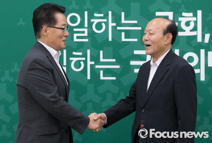 (서울=포커스뉴스) 박지원(왼쪽) 국민의당 비상대책위원장이 8일 오전 서울 여의도 국회를 방문한 이창복 6·15공동선언실천 남측위원회 상임대표의장과 면담에 앞서 인사하고 있다.