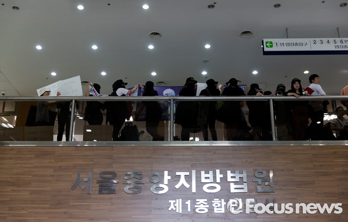 (서울=포커스뉴스) 8일 오후 서울중앙지방법원에서 전 여자친구와 민사소송 중인 가수 김현중의 홍콩, 일본, 중국 팬들이 김현중을 응원하는 손피켓을 들고 있다.