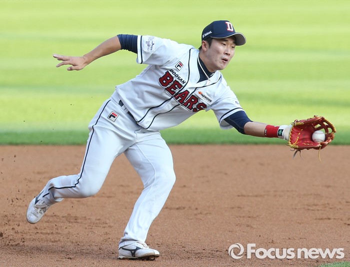 (서울=포커스뉴스) 8일 서울 잠실구장에서 열린 2016 프로야구 KIA-두산 경기 1회초 1사 1루에서 두산 3루수 허경민이 KIA 김주찬의 타구를 잡고 있다.