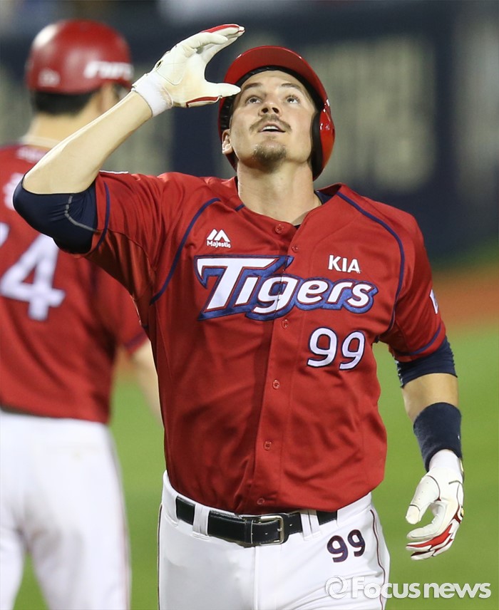 (서울=포커스뉴스) 8일 서울 잠실구장에서 열린 2016 프로야구 KIA-두산 경기 5회초 1사1루에서 KIA 필이 연타석 홈런을 치고 홈인하며 세리머니를 하고 있다.