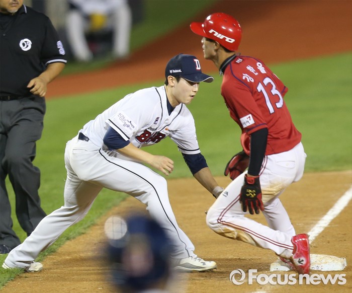(서울=포커스뉴스) 8일 서울 잠실구장에서 열린 2016 프로야구 KIA-두산 경기 9회초 2사 1,2루에서 KIA 김호령으 좌익선상으로 빠지는 2루타때 1루주자 강한울이 3루에서 세이프되고 있다.