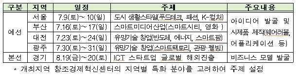 이번 행사는 지역 예선을 통해 우수팀을 선정해 본선을 진행하는 방식으로, 이번 예선대회의 주제는 지역별 창조경제혁신센터의 특성에 맞게 서울은 도시생활스타일(패션, 푸트테크), 부산은 스마트미디어산업(영화, 스마트시티) 등 다양하게 선정했다.
