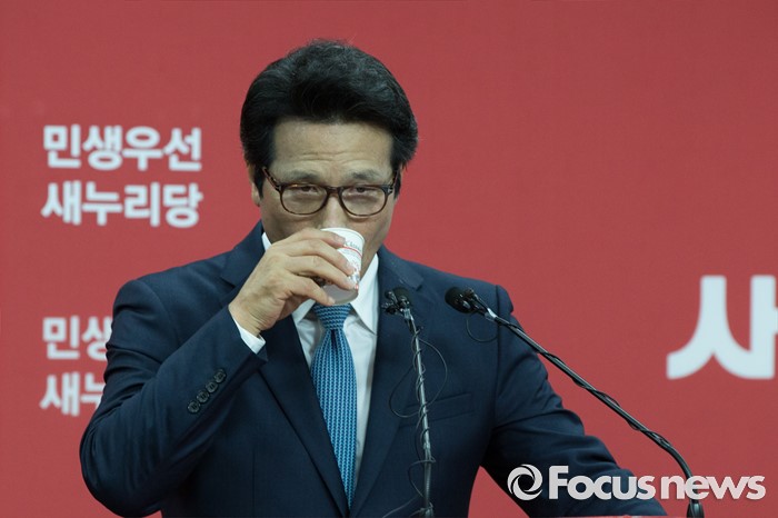 (서울=포커스뉴스) 10일 오전 서울 영등포구 새누리당 당사에서 정병국 새누리당 의원이 당대표 출마 기자회견에서 물을 마시고 있다.