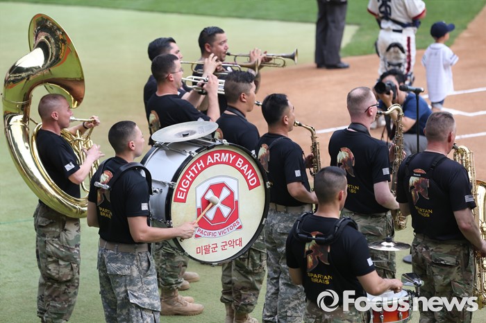 (서울=포커스뉴스) 10일 서울 잠실구장에서 열린 2016 프로야구 KIA-두산 경기에 앞서 인터내셔날 데이 이벤트를 갖고 미8군 군악대가 애국가를 연주하고 있다.
