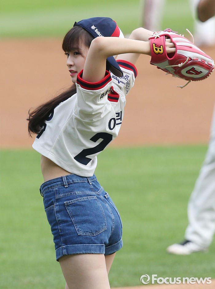 (서울=포커스뉴스) 10일 서울 잠실구장에서 열린 2016 프로야구 넥센-두산 경기에 앞서 시구자로 나온 걸그룹 '오마이걸'의 아린이 와인드업하고 있다.