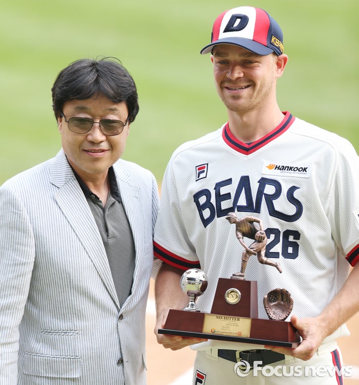 (서울=포커스뉴스) 10일 서울 잠실구장에서 열린 2016 프로야구 KIA-두산 경기에 앞서 두산 투수 보우덴의 노히트노런 시상식을 갖고 김재박 경기감독관이 기념트로피를 전달하고 함께 기념사진을 찍고 있다.