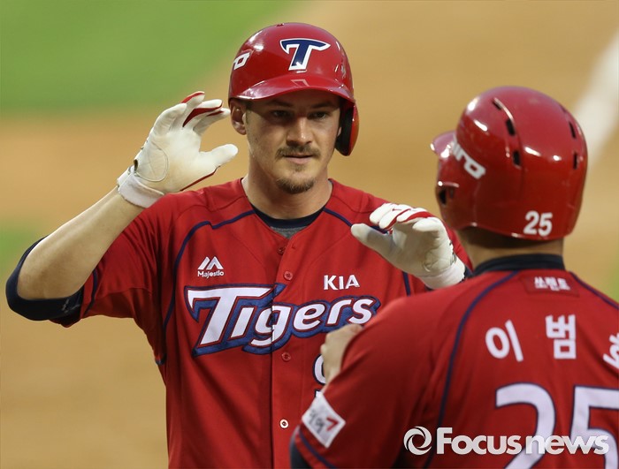 (서울=포커스뉴스) 10일 서울 잠실구장에서 열린 2016 프로야구 KIA-두산 경기 5회초 2사 1루에서 KIA 브렛 필이 좌월 2점 홈런을 치고 선행주자 이범호의 환영을 받으며 홈인하고 있다.