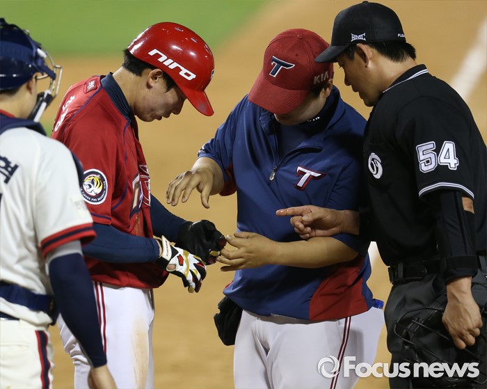 (서울=포커스뉴스) 10일 서울 잠실구장에서 열린 2016 프로야구 KIA-두산 경기 8회초 무사 1,2루에서 김준희 주심이 KIA 김호령의 투구에 맞은 손을 확인하고 있다.