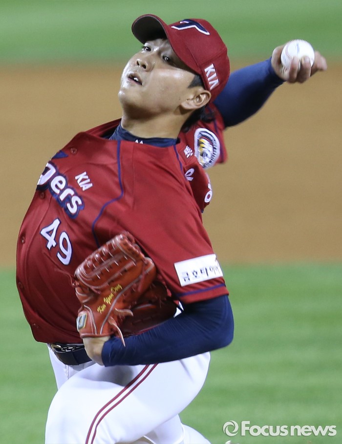 (서울=포커스뉴스) 10일 서울 잠실구장에서 열린 2016 프로야구 KIA-두산 경기에서 KIA 투수 김윤동이 9회말에 등판해 투구하고 있다.