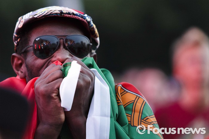BERLIN, GERMANY - JULY 10: Football fans watch the 2016 UEFA European Championship final match between France and Portugal at a public viewing area on a large outdoor screen at Brandenburg Gate on July 10, 2016 in Berlin, Germany. (Photo by Carsten Koall/Bongarts/Getty Images)