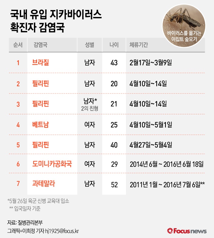 (서울=포커스뉴스) 국내 유입 지카바이러스 7번째 감염자가 발생했다. 질병관리본부에 따르면 국내 유입 지카바이러스 확진자 감염국은 필리핀, 베트남, 브라질, 도미니카공화국, 과테말라 5개국이다.