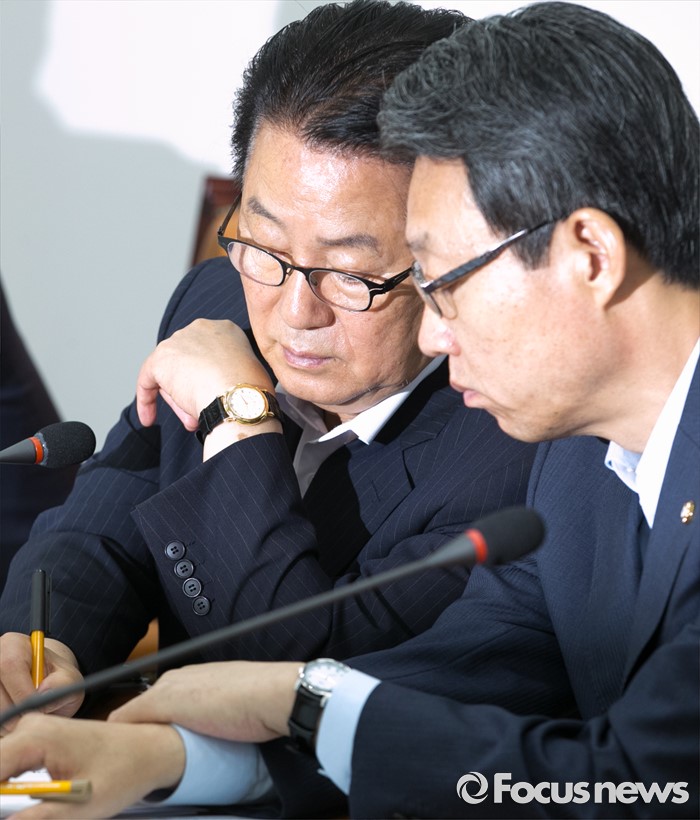 (서울=포커스뉴스) 11일 오전 서울 여의도 국회에서 열린 국민의당 비상대책위원회의에 참석한 박지원(왼쪽) 비대위원장과 김성식 정책위의장이 대화하고 있다.