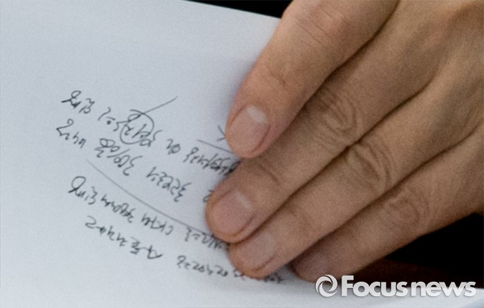 (서울=포커스뉴스) 11일 오전 서울 여의도 국회에서 열린 국민의당 비상대책위원회의에 참석한 박지원 비대위원장과 김성식 정책위의장이 대화하며 작성한 메모가 보이고 있다.