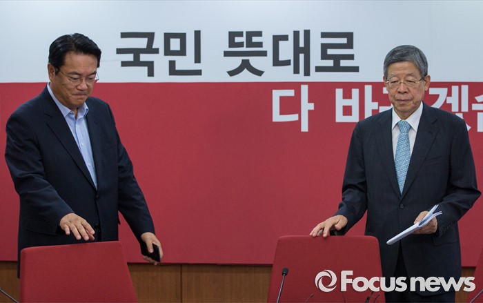 (서울=포커스뉴스) 김희옥(오른쪽) 새누리당 혁신비상대책위원장과 정진석 새누리당 원내대표가 11일 오전 서울 여의도 새누리당사에서 열린 혁신비상대책위원회의에 참석하기 위해 회의실로 들어서고 있다.