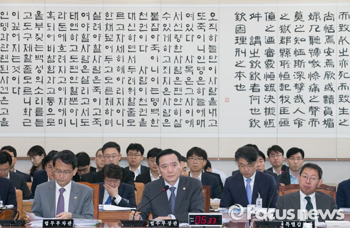 (서울=포커스뉴스) 11일 오전 서울 여의도 국회에서 열린 법제사법위원회 전체회의에 참석한 김현웅 법무부 장관이 의원들의 질의를 듣고 있다. 왼쪽부터 이창재 법무부 차관, 김 장관, 이석수 특별감찰관.