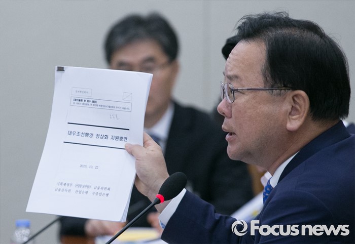 (서울=포커스뉴스) 11일 오전 서울 여의도 국회에서 열린 기획재정위원회 전체회의에 참석한 김부겸 더불어민주당 의원이 서별관회의에 보고된 문건이라는 '대우조선해양 정상화 지원방안' 보고서를 들고 발언하고 있다.
