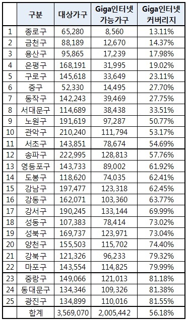 더구나 서울시 25개구 가운데 11개구는 서울시 평균 커버리지에 크게 미치지 못했다. 특히 종로구의 커버리지는 13.1%, 금천구는 14.4%, 용산구는 17.9%에 불과했다. 기가인터넷 커버리지 하위 5개구의 전체 56만 가구 가운데 기가 인터넷이 가능한 가구는 10만 가구로 18.5% 수준에 그쳤다.
