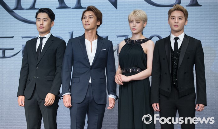 (서울=포커스뉴스) 11일 오후 서울 종로구 포시즌스호텔 서울에서 열린 뮤지컬 '도리안 그레이' 제작발표회에 참석한 배우 최재웅(왼쪽부터), 박은태, 홍서영, 김준수가 포토타임을 갖고 있다.