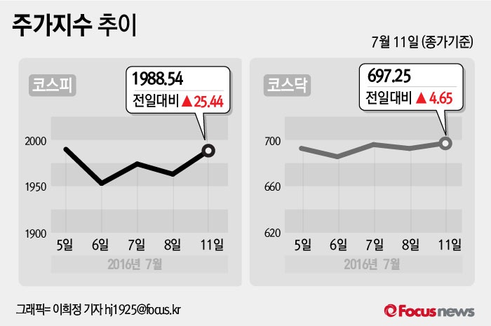 (서울=포커스뉴스) 11일 코스피지수는 전날보다 1.30%(25.44포인트) 오른 1988.54에 장을 마쳤다. 코스닥지수는 전일 대비 0.67%(4.65포인트) 오른 697.25에 마감했다.